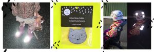 Heijastavia tarroja vaatteissa ja ulkovarusteissa. Keskellä kettutarra